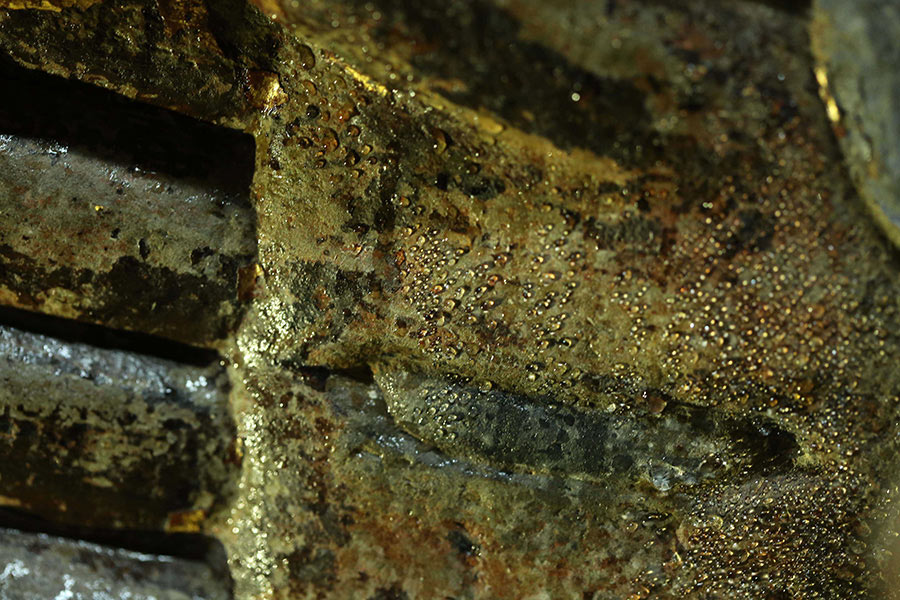 Dazu Thousand-hand Bodhisattva is covered with condensation water due to the hot and humid weather on June 5, 2014. (Xinhua/Luo Guojia)