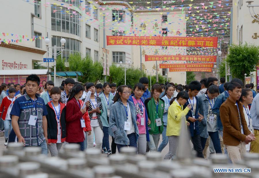 | "Gaokao" examinees walk towards an exam site of the national college entrance exam in Qamdo Prefecture, southwest China's Tibet Autonomous Region, June 8, 2014. More than 19,600 examinees in Tibet this year took part in the annual matriculation, which was held on June 7 and June 8. (Xinhua/Wang Shoubao) |
