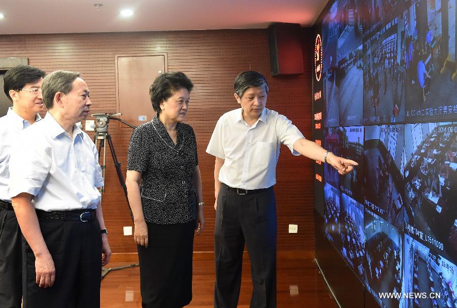 | Chinese Vice Premier Liu Yandong (C), also a member of the Political Bureau of the Communist Party of China (CPC) Central Committee, examines a command system for the National College Entrance Exam (NCEE) during an inspection tour at the Test Center of the Ministry of Education in Beijing, capital of China, June 8, 2014. (Xinhua/Liu Jiansheng) |