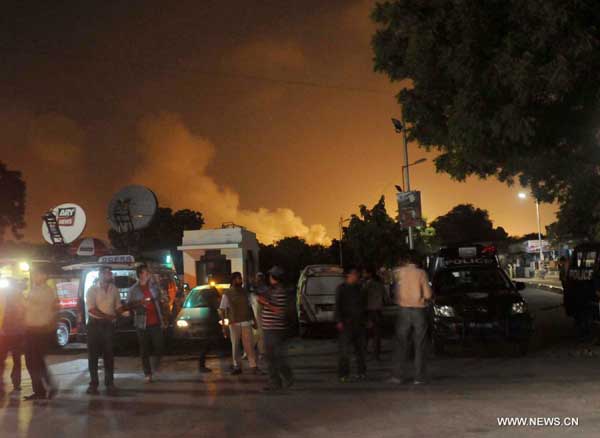 Smoke rises from Karachi airport following an attack by gunmen in southern Pakistani port city of Karachi on June 9, 2014. At least four security personnel were killed on Sunday night when some unknown militants attacked a terminal of a airport in Pakistan's southern port city of Karachi, local media reported. (Xinhua/Masroor)