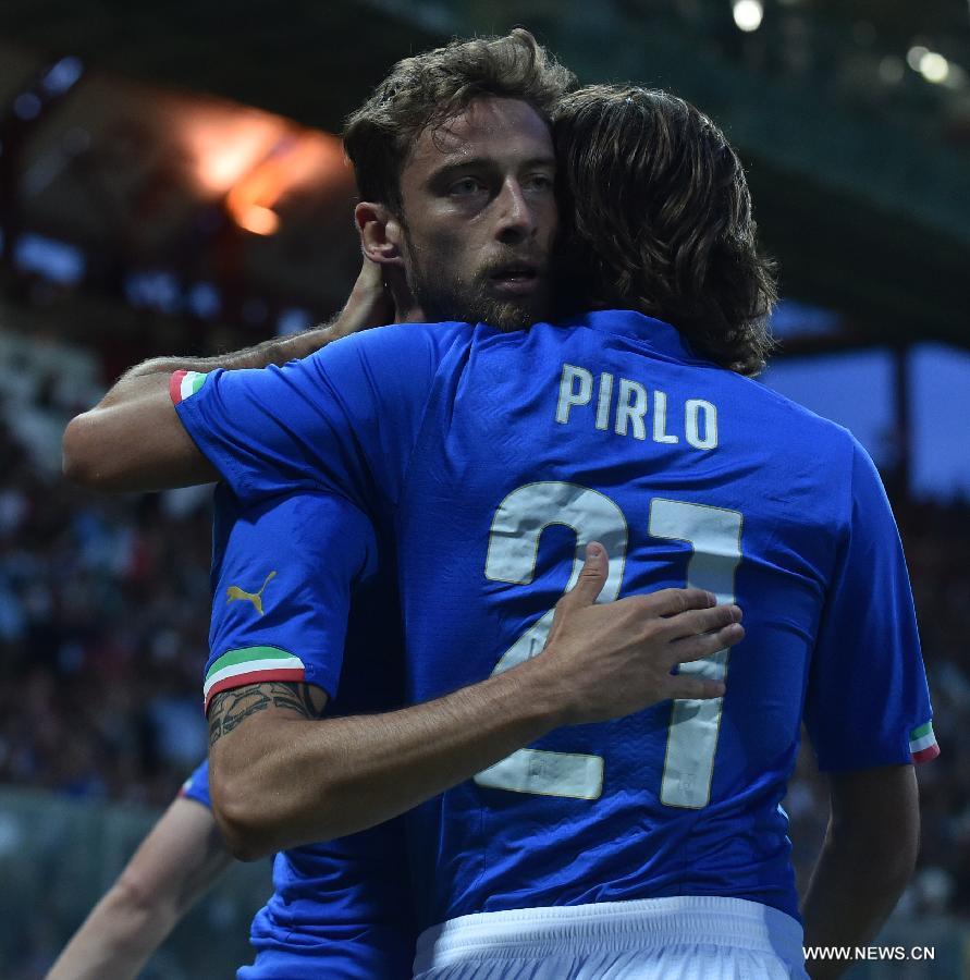 Claudio Marchisio (L) of Italy celebrates for his goal during a friendly match against Luxembourg in Perugia, Italy, on June 4, 2014. The match ended with a 1-1 draw. (Xinhua/Alberto Lingria)
