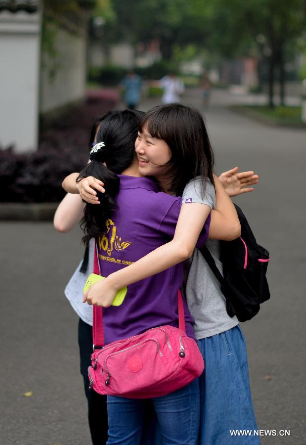 A student embraces her teacher after finishing the National College Entrance Exam (NCEE) at the First High School in Changsha, capital of central China's Hunan Province, June 8, 2014. The 2014 National College Entrance Exam ended on Sunday in most part of China (in a few provinces the NCEE will last for one more day). Statistics show that the NCEE has 9.39 million candidates in 2014, which is 270,000, or 3 percent, more than the 2013 figure. In all, there will be 6.98 million new enrollments at China's higher education institutions this year. (Xinhua/Bai Yu)