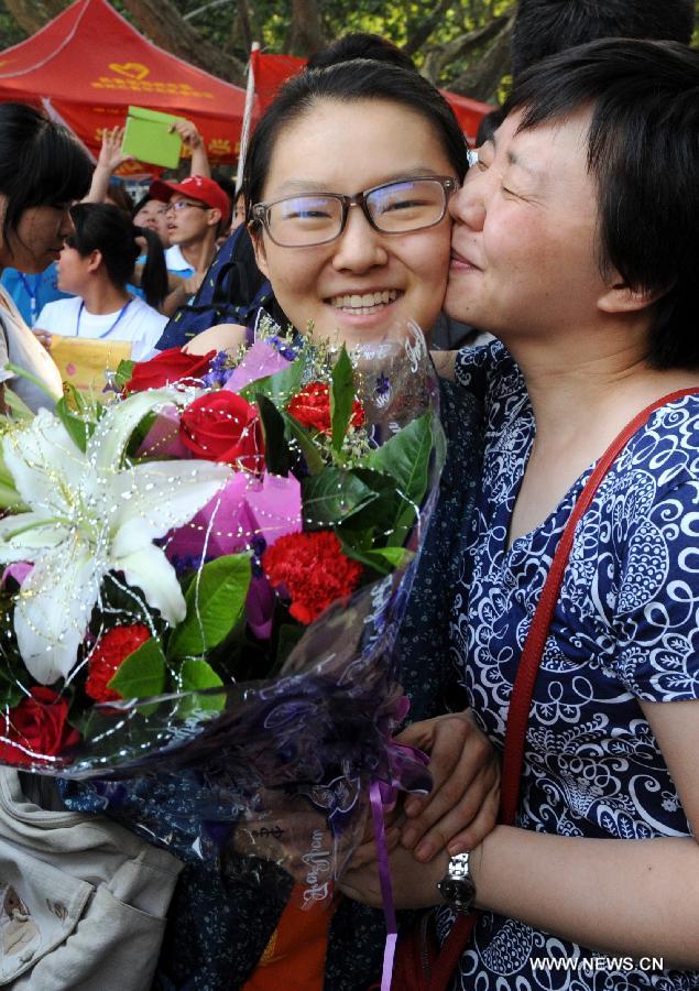A student celebrates with her parent after finishing the National College Entrance Exam (NCEE) at the Weimin High School in Zhengzhou, capital of central China's Henan Province, June 8, 2014. The 2014 National College Entrance Exam ended on Sunday in most part of China (in a few provinces the NCEE will last for one more day). Statistics show that the NCEE has 9.39 million candidates in 2014, which is 270,000, or 3 percent, more than the 2013 figure. In all, there will be 6.98 million new enrollments at China's higher education institutions this year. (Xinhua/Zhu Xiang)