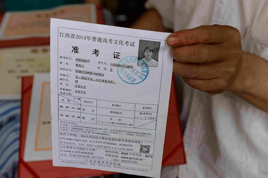 Liu's admission ticket for the National College Entrance Examinations. (Photo/Xinhua)