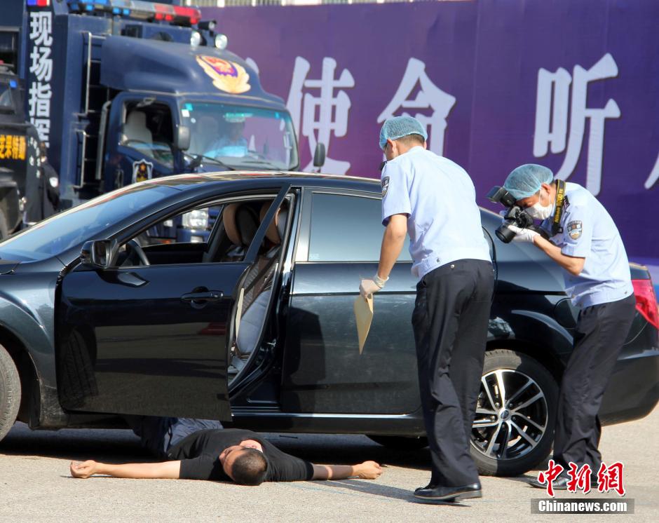 An anti-terrorism drill is held in Yantai, east China's Shandong province on June 5, 2014. The dirll stimulated scenes of explosions, knife attacks and hostage-takings near hotels and schools. SWAT police force, armed police force, fire departments, traffic police, health departments and the power departments joined their efforts to complete exercises including traffic controls, arrests, investigations and detections. (Chinanews.com/Wang Jiaoni)