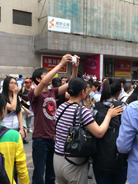 A parents takes photos to mark the ending moment of the National College Entrance Exam (NECC) on June 8, 2014. (People’s Daily Online/ Wang Xin)