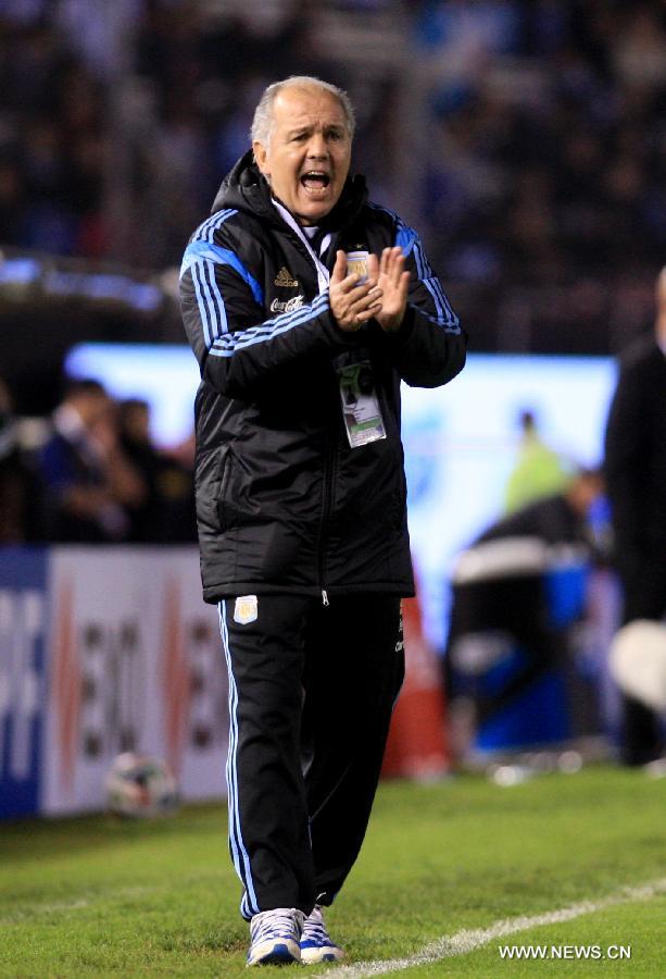 Argentina's head coach Alejandro Sabella reacts during a friendly match against Trinidad and Tobago, prior to the 2014 FIFA World Cup, held at the Monumental Stadium, in Buenos Aires, Argentina, on June 4, 2014. (Xinhua/Martin Zabala)