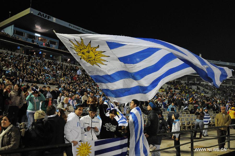 An Uruguayan fan waves a national flag during a friendly match between Uruguay and Slovenia, prior to the 2014 FIFA World Cup, held at the Centenario Stadium, in Montevideo, capital of Uruguay, on June 4, 2014. (Xinhua/Nicolas Celaya)