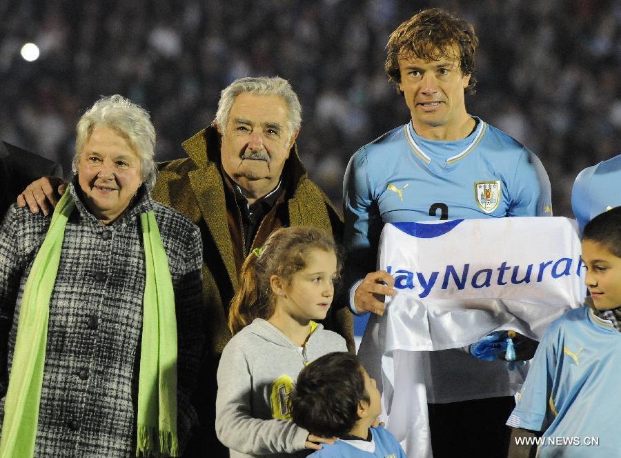 | Uruguay's President Jose Mujica (2nd L) and Uruguay's Diego Lugano (2nd R) pose for photograph during a friendly match against Slovenia, prior to the 2014 FIFA World Cup, held at the Centenario Stadium, in Montevideo, capital of Uruguay, on June 4, 2014. (Xinhua/Nicolas Celaya) |