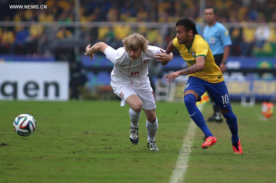 Brazil's Neymar (R) vies for the ball with Dusan Basta of Serbia during the friendly match previous to the FIFA World Cup held on the Morumbi Stadium in Sao Paulo, Brazil, on June 6, 2014. (Xinhua/Rahel Patrasso)