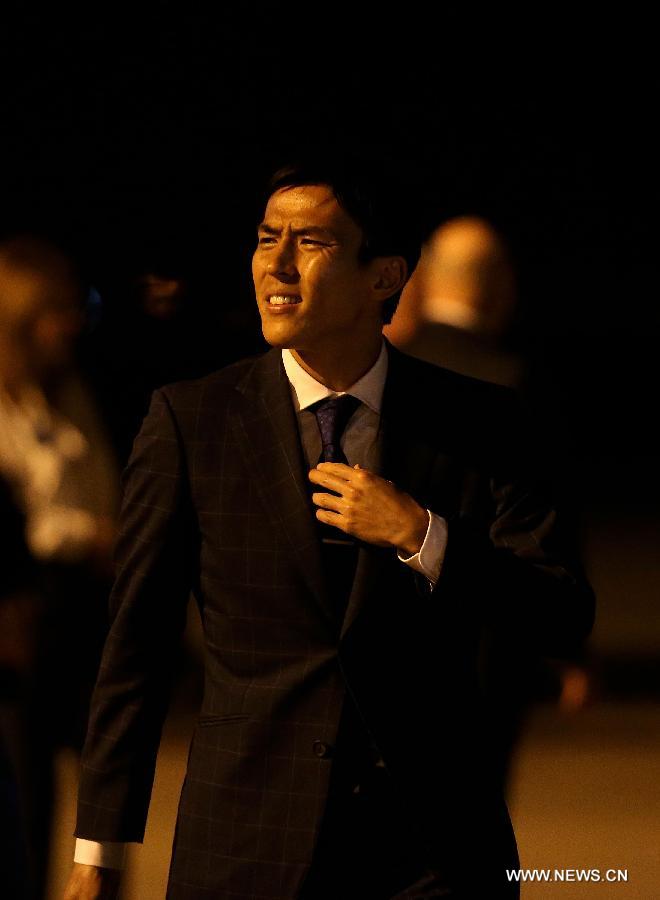 Hasebe Makoto of Japan's national soccer team walks out as the team arrive at the Viracopos airport prior of the 2014 World Cup in Campinas, Brazil, June 7, 2014. (Xinhua/Liao Yujie)