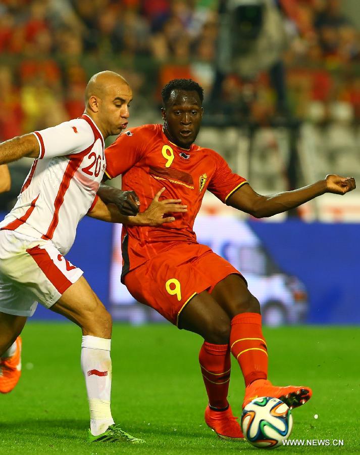 Belgium's Romelu Lukaku (R) passes the ball during a friendly soccer match against Tunisia in Brussels, on June 7, 2014. Belgium won 1-0. (Xinhua/Gong Bing)