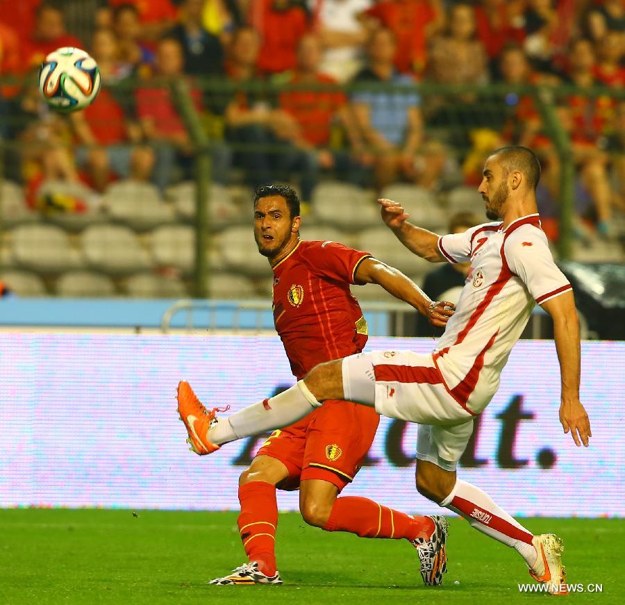 Belgium's Nacer Chadli (L) vies during a friendly soccer match against Tunisia in Brussels, on June 7, 2014. Belgium won 1-0. (Xinhua/Gong Bing)