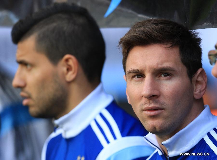 Argentina's Lionel Messi (R) watches on the bench during the friendly match against Slovenia prior to the FIFA World Cup at Ciudad de La Plata Stadium, in La Plata, Argentina, on June 7, 2014. (Xinhua/Victor Carreira/TELAM)
