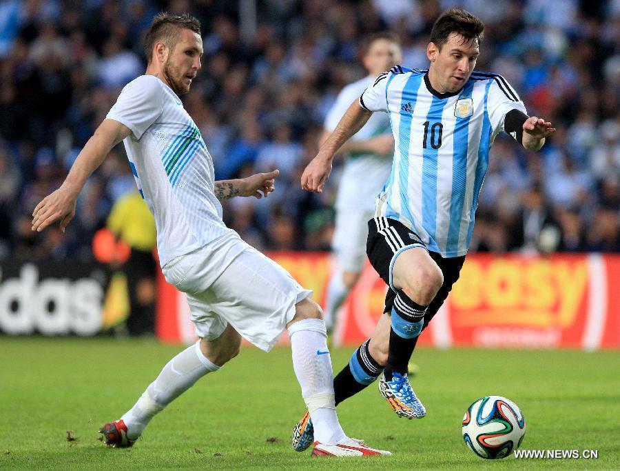 Argentina's Lionel Messi (R) vies for the ball with Branko Ilic of Slovenia during the friendly match prior to the FIFA World Cup at Ciudad de La Plata Stadium, in La Plata, Argentina, on June 7, 2014. (Xinhua/Victor Carreira/TELAM)