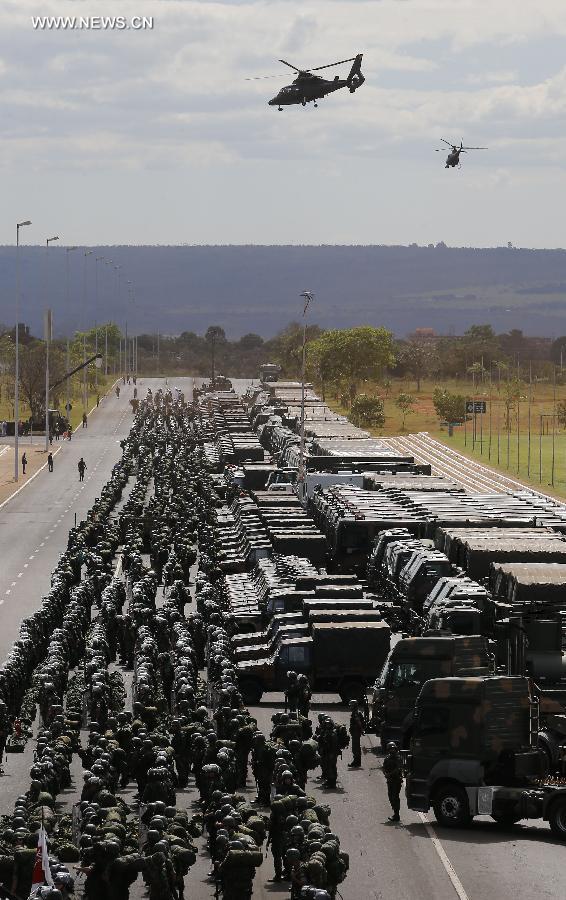Members of armed forces participate in operational training for FIFA World Cup in Brasilia, Brazil, June 8, 2014. About 3,900 Army, Navy and Air Force Soldiers will take part in the security operations during the World Cup in Brazil. (Xinhua/Dida Sampaio/Estadao Conteudo/Agencia Estado)