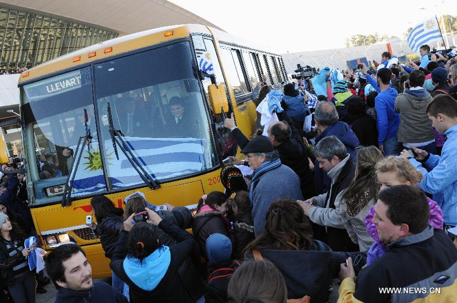 | Supporters of Uruguay's national soccer team gather around the bus carring players before their departure to the 2014 FIFA World Cup Brazil, in the Carrasco International Airport, in Montevideo, capital of Uruguay, on June 9, 2014. (Xinhua/Nicolas Celaya) |