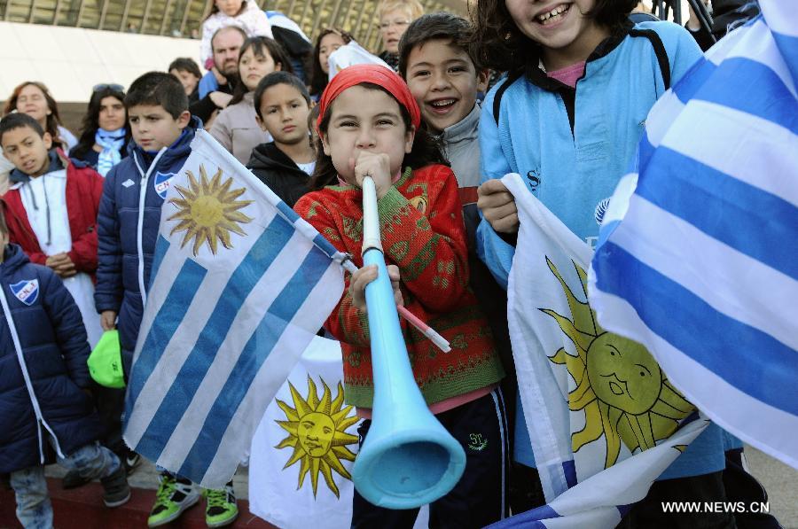 Supporters of Uruguay's national soccer team see players off to the 2014 FIFA World Cup Brazil, in the Carrasco International Airport, in Montevideo, capital of Uruguay, on June 9, 2014.(Xinhua/Nicolas Celaya)