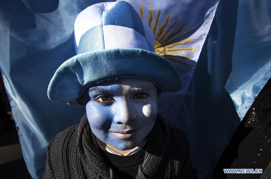 A boy takes part in a farewell ceremony to Argentina's national soccer team players who will travel to Brazil's Belo Horizonte to take part in the 2014 FIFA World Cup, in Ezeiza, 30km north of Buenos Aires, capital of Argentina, on June 9, 2014. (Xinhua/Martin Zabala)