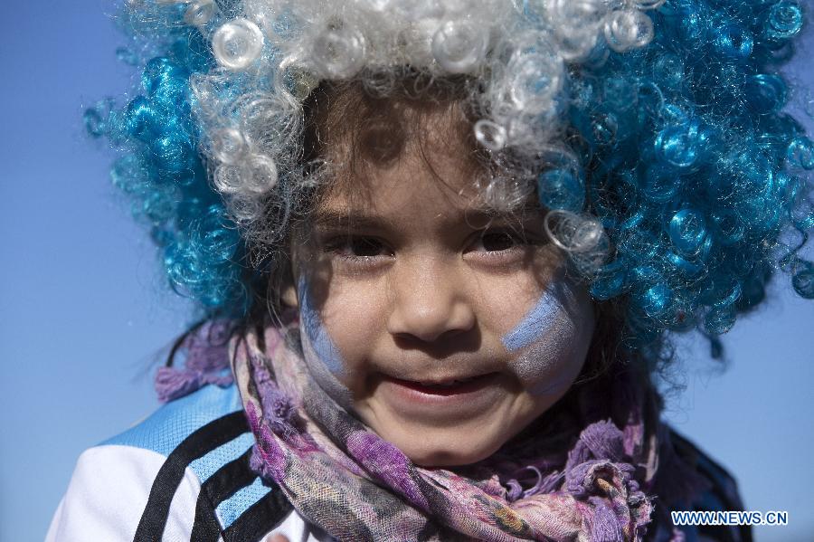 | A kid takes part in a farewell ceremony to Argentina's national soccer team players who will travel to Brazil's Belo Horizonte to take part in the 2014 FIFA World Cup, in Ezeiza, 30km north of Buenos Aires, capital of Argentina, on June 9, 2014. (Xinhua/Martin Zabala) |