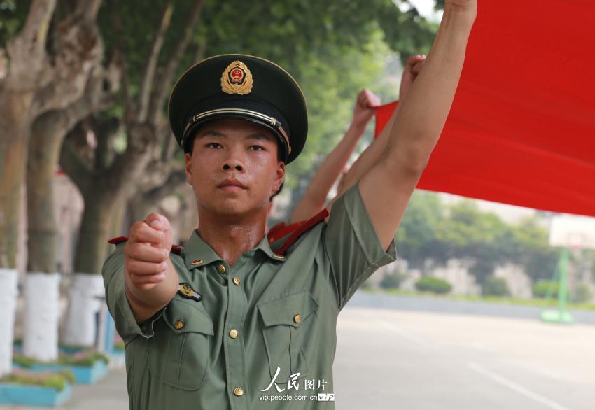 On June 7, more than 20 soldiers take part in training at Nanjing detachment of People's Armed Police Corps. The soldiers, with an average height of 183 cm and weight between 73 and 75 kg, were selected from about 3,000 soldiers to perform the flag-raising task at the opening and closing ceremonies of the Youth Olympic Games (YOG). (People .com. cn/Photo)