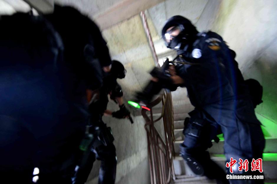 A SWAT team conducts anti-terror drill in Fuzhou, southeast China’s Fujian province on June 9, 2014. They demonstrated skills including emergency response, explosive handling, bomb disposal, search and shooting. Established in 2005, the team has 281 members with average age of 26.3 years old. (CNS Photo/Wang Dongming)