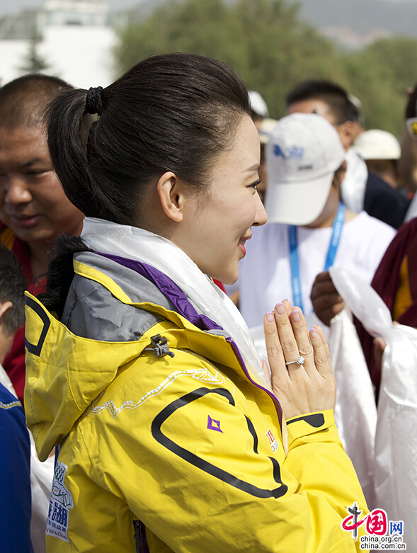 Chinese billiards star Pan Xiaoting attended the blessing ceremony of the first Qinghai Lake Electric Vehicle International Challenge Competition on June 9 in Xining. [Photo by Wu Wenda / China.org.cn]