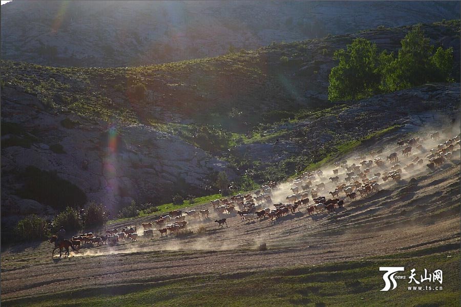 Sheep and cattle are shepherded across grassland during the summer livestock migration in Altay, northwest China’s Xinjiang on June 8, 2014. This year, about 1.5 million cattle and sheep will take 10 days moving to the cooler area in remote mountains in Altay. (Photo/www.ts.cn)
