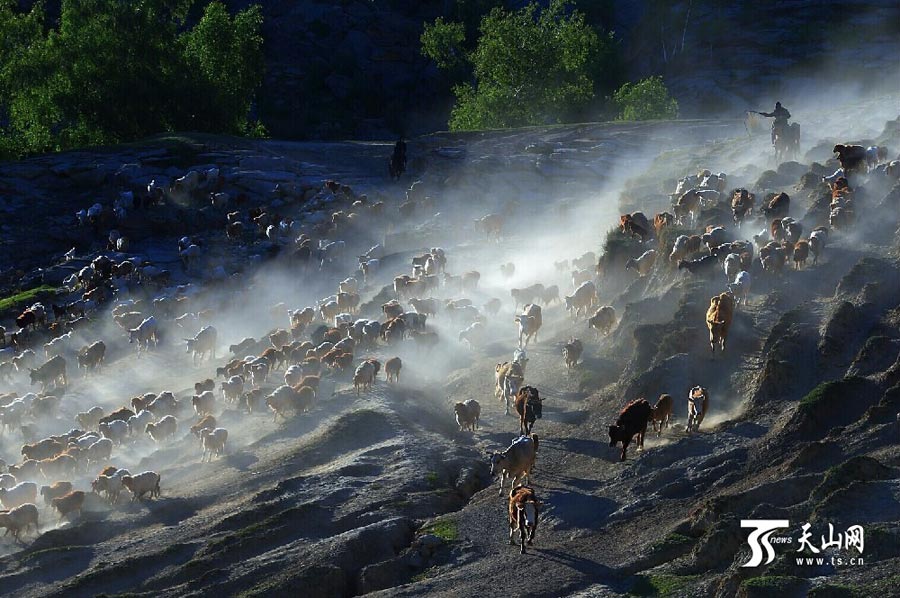 Sheep and cattle are shepherded across grassland during the summer livestock migration in Altay, northwest China’s Xinjiang on June 8, 2014. This year, about 1.5 million cattle and sheep will take 10 days moving to the cooler area in remote mountains in Altay. (Photo/www.ts.cn)