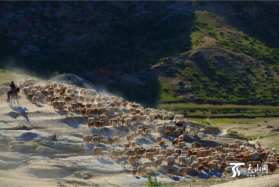 Sheep and cattle are shepherded across grassland during the summer livestock migration in Altay, northwest China’s Xinjiang on June 8, 2014. This year, about 1.5 million cattle and sheep will take 10 days moving to the cooler area in remote mountains in Altay. (Photo/www.ts.cn)
