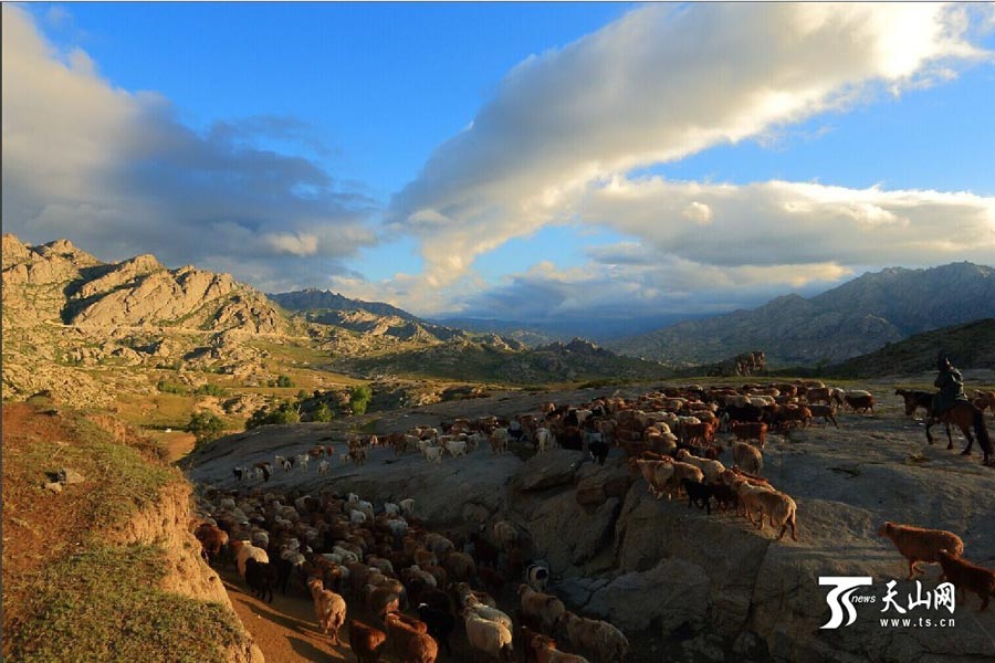 Sheep and cattle are shepherded across grassland during the summer livestock migration in Altay, northwest China’s Xinjiang on June 8, 2014. This year, about 1.5 million cattle and sheep will take 10 days moving to the cooler area in remote mountains in Altay. (Photo/www.ts.cn)