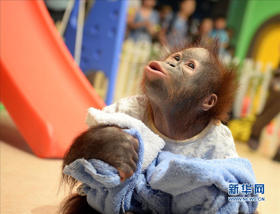A baby Orangutan sits on the floor to play games at a zoo in Guangzhou on May 31, 2014. (Liu Dawei/Xinhua News Agency)