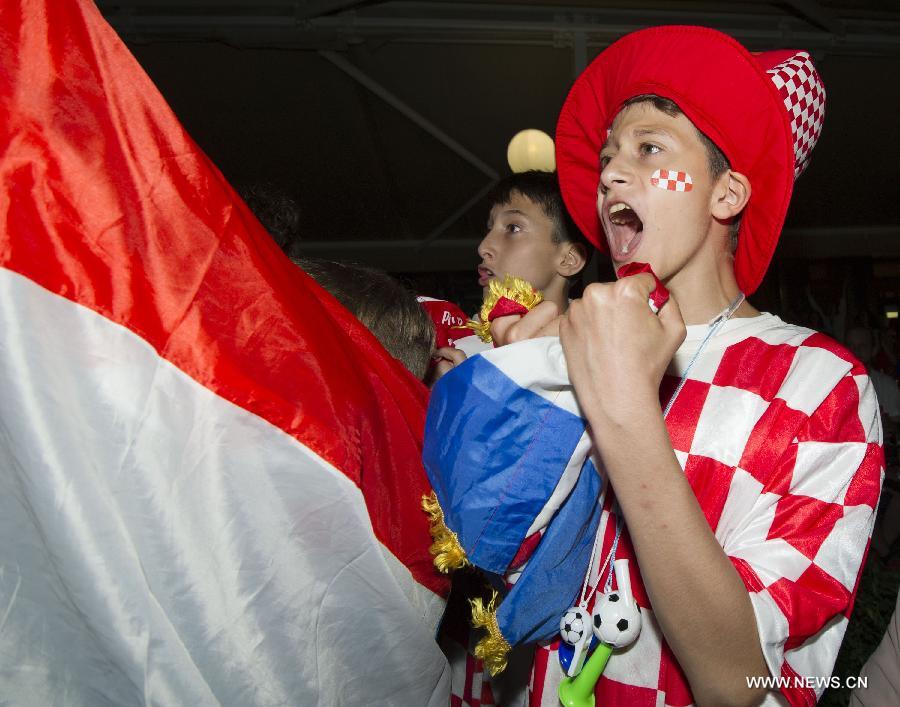 Croatian soccer fans react while watching the televised match between Croatia and Brazil, in Zagreb, Croatia, June 12, 2014. Thousands of fans on Thursday watched the FIFA World Cup opening match on a big screen at Zagreb's central square. (Xinhua/Miso Lisanin)