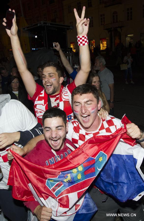 | Croatian soccer fans cheer while watching the televised match between Croatia and Brazil, in Zagreb, Croatia, June 12, 2014. Thousands of fans on Thursday watched the FIFA World Cup opening match on a big screen at Zagreb's central square. (Xinhua/Miso Lisanin) |