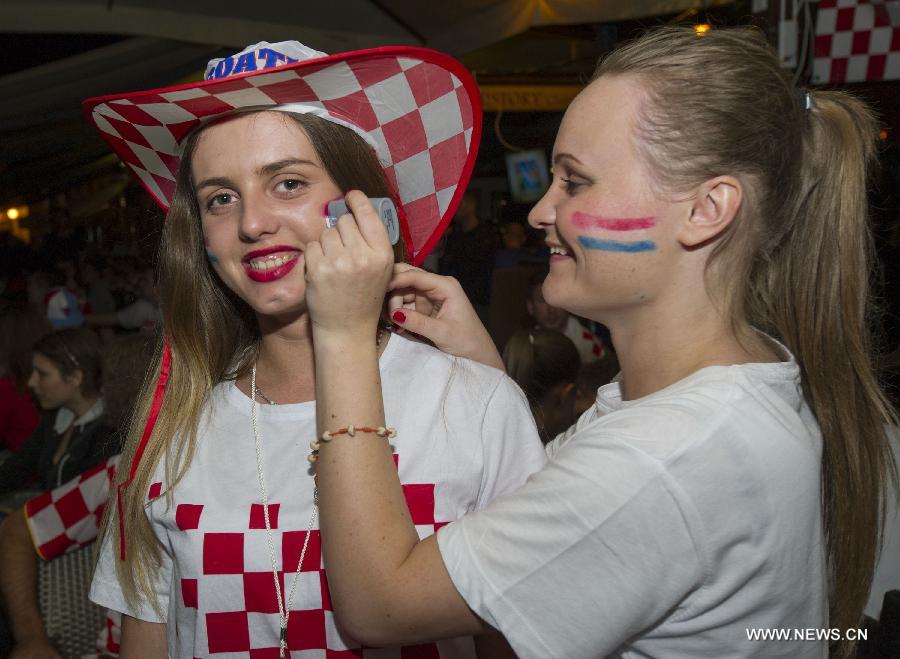 Croatian soccer fans prepare for a match between Croatia and Brazil, in Zagreb, Croatia, June 12, 2014. Thousands of fans on Thursday watched the FIFA World Cup opening match on a big screen at Zagreb's central square. (Xinhua/Miso Lisanin)