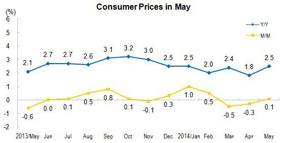The May China’s Consumer Price Index (CPI) increased by an annual 2.5 percent, and the producer price index (PPI) contracted 1.4 percent, while on a monthly basis, the CPI edged up 0.1 percent and PPI dropped 1.4 percent.