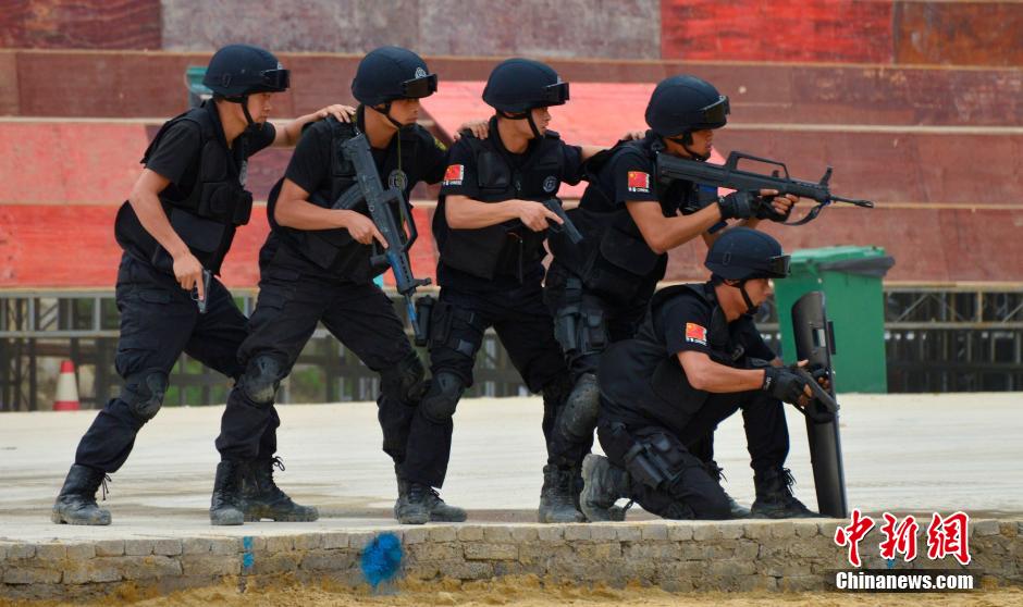 Police in Qiannan Prefecture, southwest China's Guizhou Province, holds a drill to practice anti-terrorism, emergency response and other skills to improve their ability in emergency disposal on June 12, 2014. (Chinanews/Wu Qingyuan)