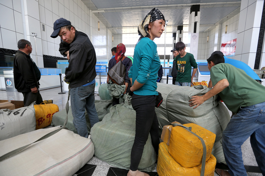 Merchants from Kazakhstan pack goods bought at a market in the Horgos International Border Cooperation Center in Xinjiang's Ili Kazakh autonomous prefecture.(Source: China Daily)
