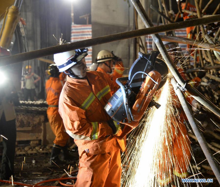 Rescuers work at the site of factory collapse in Yilong New Area of the Bouyei-Miao Autonomous Prefecture of Qianxinan, southwest China's Guizhou Province, June 16, 2014. Five workers have been rescued but four others remain trapped after the collapse of a steel tunnel at the ferroalloy plant here, which occured at 10:20 p.m. on Sunday. The cause of the accident is being investigated. (Xinhua/Liu Yongsong)