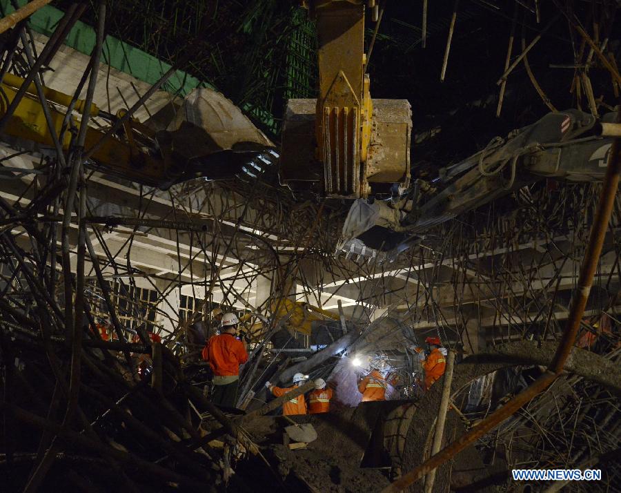 Rescuers work at the site of factory collapse in Yilong New Area of the Bouyei-Miao Autonomous Prefecture of Qianxinan, southwest China's Guizhou Province, June 16, 2014. Five workers have been rescued but four others remain trapped after the collapse of a steel tunnel at the ferroalloy plant here, which occured at 10:20 p.m. on Sunday. The cause of the accident is being investigated. (Xinhua/Liu Yongsong)