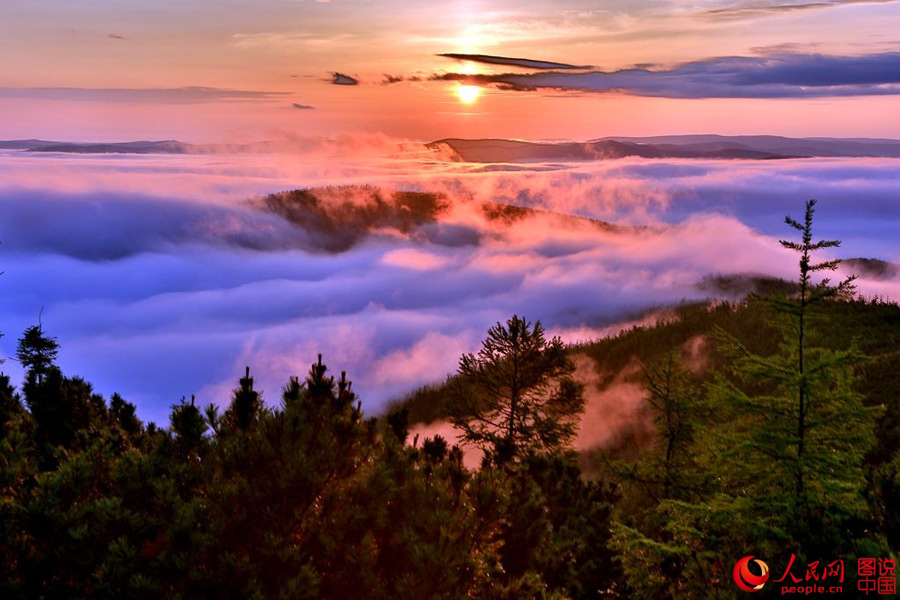 With an altitude of 1,404 meters, the Small Bule Mountain is the second highest among the Greater Khingan Mountains in northeast China. Amid the morning fog, the huge red sun rises. What a spectacular sight!(People's Daily Online)
