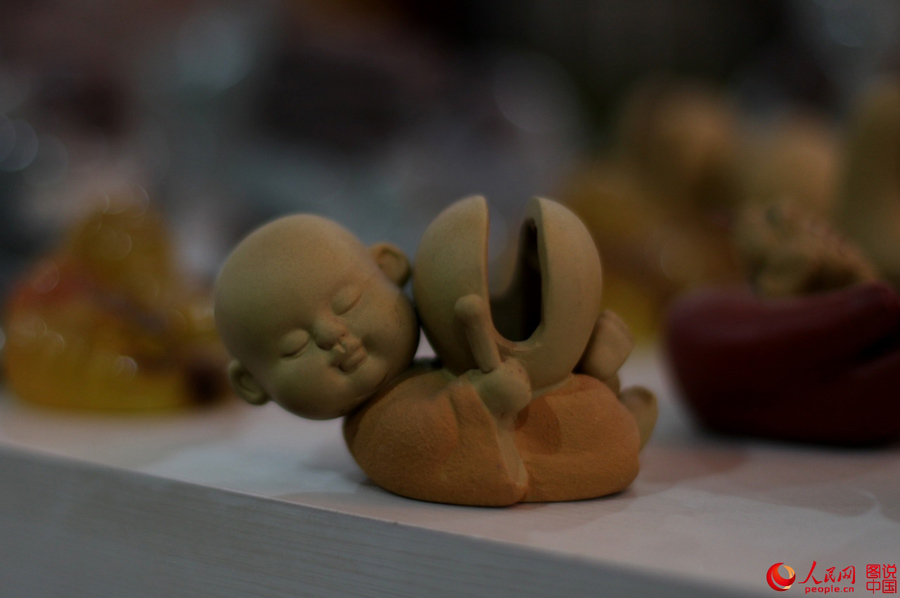 A tea pet is the pet kept by tea lovers and nourished by tea water. It is a kind of artware made by purple sands or clay. When enjoying the tea, the drinker will smear or sprinkle tea water on the tea pets. As time goes by, the tea pets will be moist with soft luster and tea aroma. Tea pets usually take the shape of mythical Chinese beasts, human figures and small animals to express good wishes.(People's Daily Online)