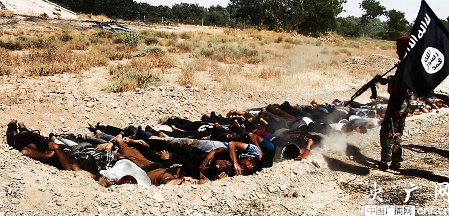 An image uploaded on June 14, 2014 on the jihadist website Welayat Salahuddin allegedly shows militants of the Islamic State of Iraq and the Levant (ISIL) executing dozens of captured Iraqi security forces members at an unknown location in the Salaheddin province. A major offensive spearheaded by ISIL but also involving supporters of executed dictator Saddam Hussein has overrun all of one province and chunks of three others since it was launched on June 9. [Photo/Cnr.cn]