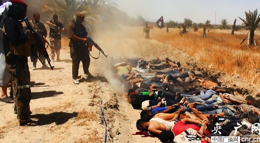 | An image uploaded on June 14, 2014 on the jihadist website Welayat Salahuddin allegedly shows militants of the Islamic State of Iraq and the Levant (ISIL) executing dozens of captured Iraqi security forces members at an unknown location in the Salaheddin province. A major offensive spearheaded by ISIL but also involving supporters of executed dictator Saddam Hussein has overrun all of one province and chunks of three others since it was launched on June 9. [Photo/Cnr.cn] |