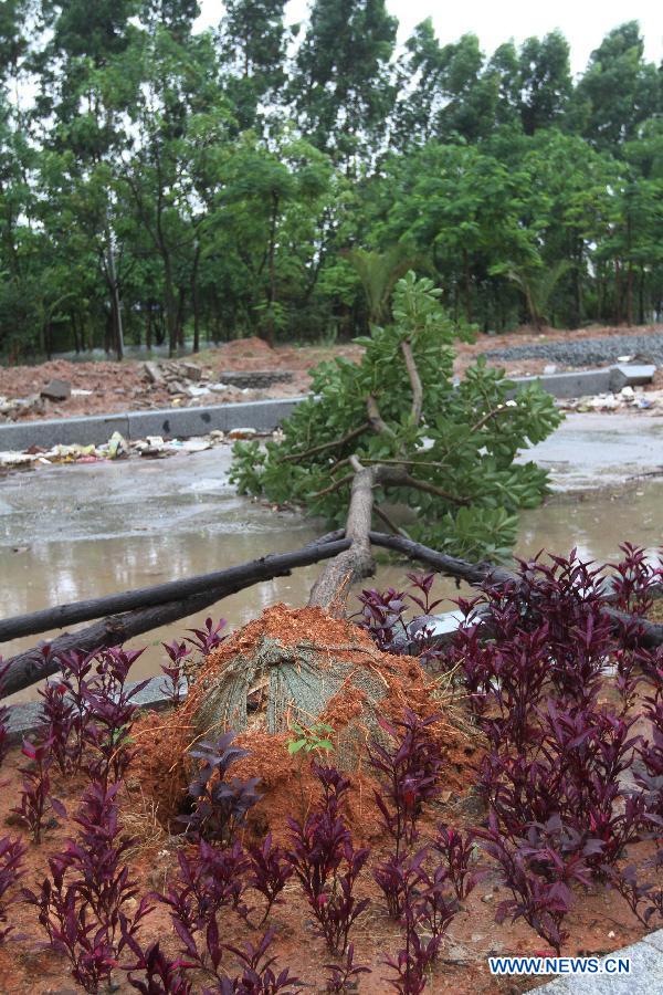 A tree lies uprooted on a flooded street in Jimei District of Xiamen, southeast China's Fujian Province, June 16, 2014. Torrential rain hit Xiamen and four other cities in Fujian after typhoon Hagibis made its landfall in Shantou of the neighbouring Guangdong Province on Sunday night. (Xinhua/Zeng Demeng)