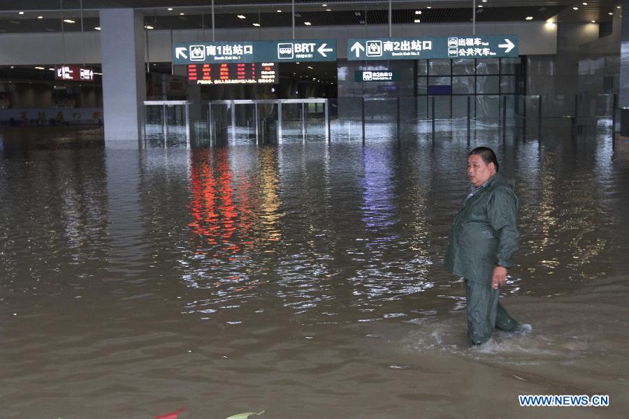| A staff member examines the waterlogged underground hall at Xiamen North Railway Station in Jimei District of Xiamen, southeast China's Fujian Province, June 16, 2014. Torrential rain hit Xiamen and four other cities in Fujian after typhoon Hagibis made its landfall in Shantou of the neighbouring Guangdong Province on Sunday night. (Xinhua/Zeng Demeng) |