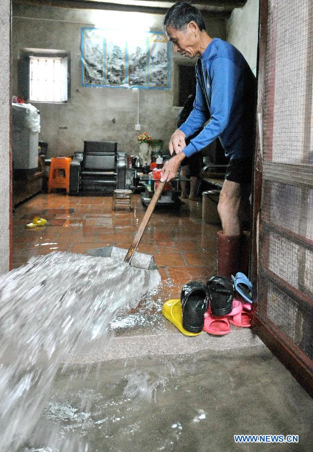 A villager clears water out of his house at Xixia Village of Dongqiao Town in Zhao'an County, southeast China's Fujian Province, June 16, 2014. The typhoon Hagibis brought torrential rain to Fujian on Monday. (Xinhua/Lin Shanchuan)
