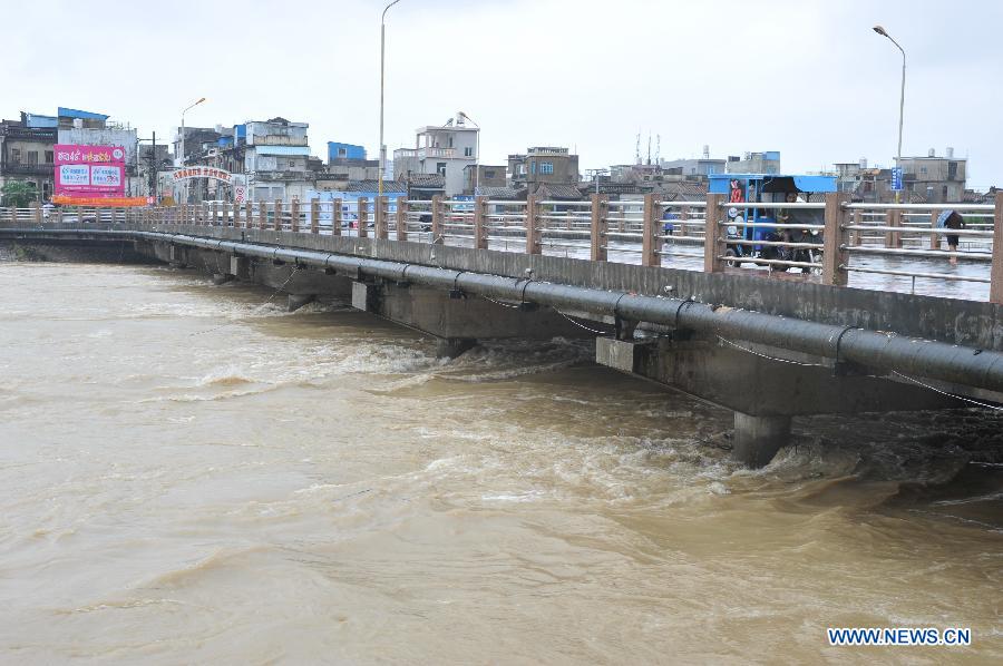 Dongxi River reaches its warning water level in Zhao'an County of southeast China's Fujian Province on June 16, 2014. The typhoon Hagibis brought torrential rain to Fujian on Monday. (Xinhua/Lin Shanchuan)
