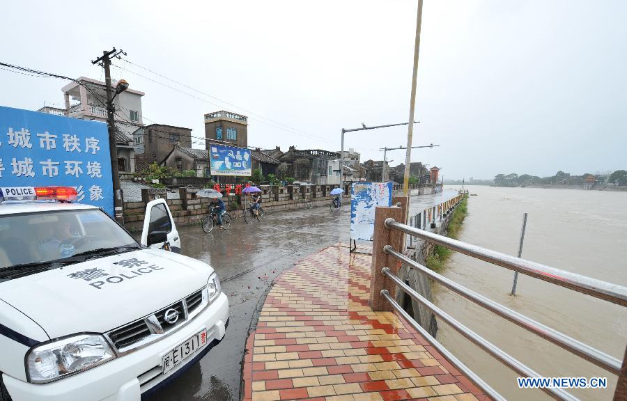 A bridge over the Dongxi River is closed after the river reached its warning water level in Zhao'an County, southeast China's Fujian Province. The typhoon Hagibis brought torrential rain to Fujian on Monday. (Xinhua/Lin Shanchuan)