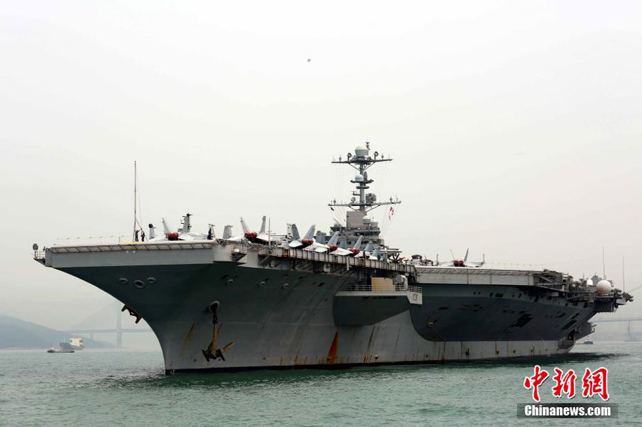 The US Navy's aircraft carrier USS George Washington docks in Hong Kong and welcomes four People's Liberation Army members for a VIP visit on Monday, June 16, 2014. [Photo: Chinanews.com]